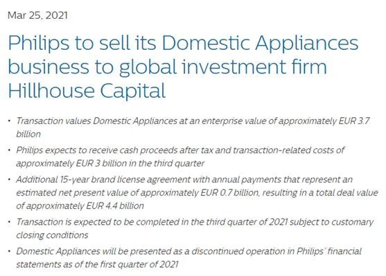 2021年3月25日,全球领先的健康科技公司皇家飞利浦(NYSE:PHG;AEX:PHIA)宣布已签署协议,将其家用电器业务出售给知名投资公司高瓴,交易金额约为37亿欧元。
