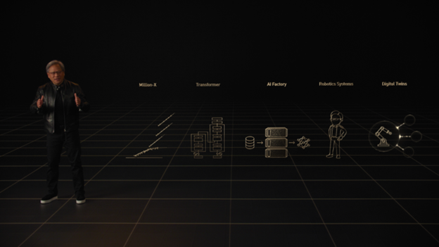 黄仁勋还提出了影响行业发展的五个趋势:million-X 百万倍计算速度飞跃,大幅加快 AI 速度的Transformers,成为 AI 工厂的数据中心,对机器人系统的需求呈指数级增长以及下一个 AI 时代的数字孪生。