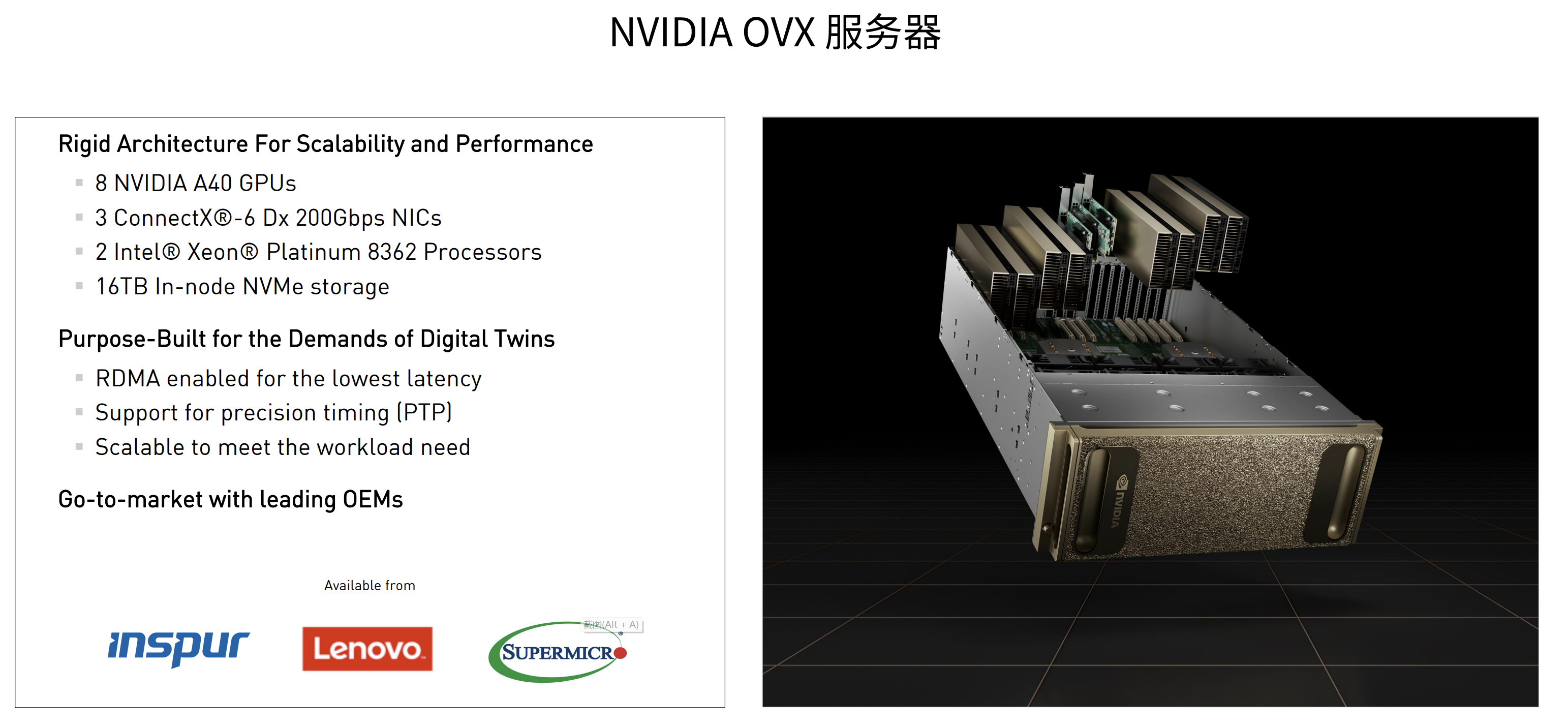 但为了使数字孪生比较完美的实现应用场景,NVIDIA在今年还发布了OVX服务器,以确保可以更好的来保持物理上的准确性,遵循物理的定律,让数据中心具备可扩展性、低延时和精准时间的特点,来满足数字孪生四大特性的要求,也包括去支撑Omniverse数字孪生平台,能够更好的为客户提供一个数字孪生的基础设施。