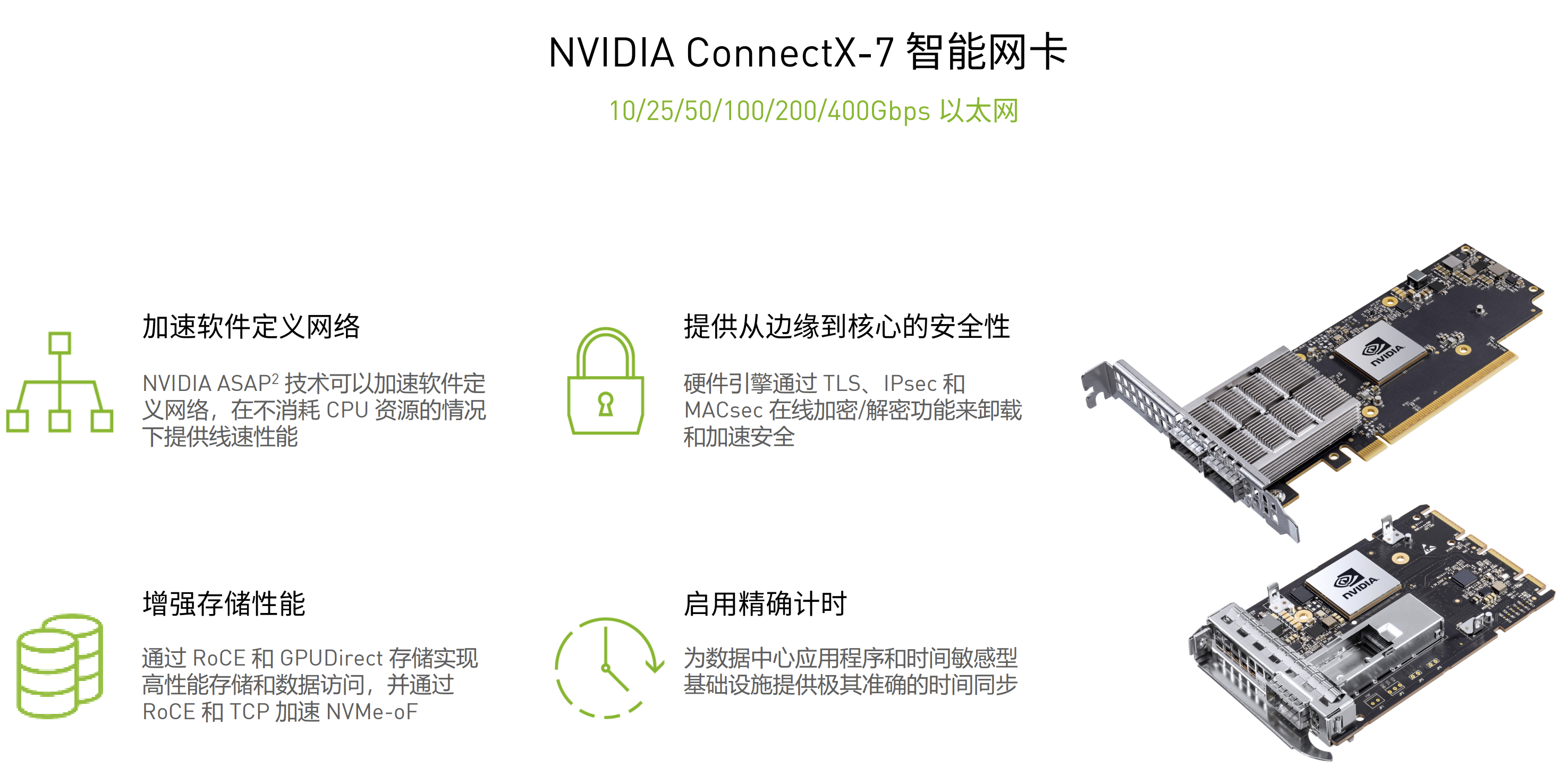 ConnectX-7智能网卡通过RoCE和GPUDirect存储实现高性能存储和数据访问能力,为未来数据中心应用程序和时间敏感型基础设施提供极其准确的时间同步,为敏捷的、高性能的解决方案提供助力,成为未来Spectrum-4端到端以太网网络平台中重要的组成部分。
