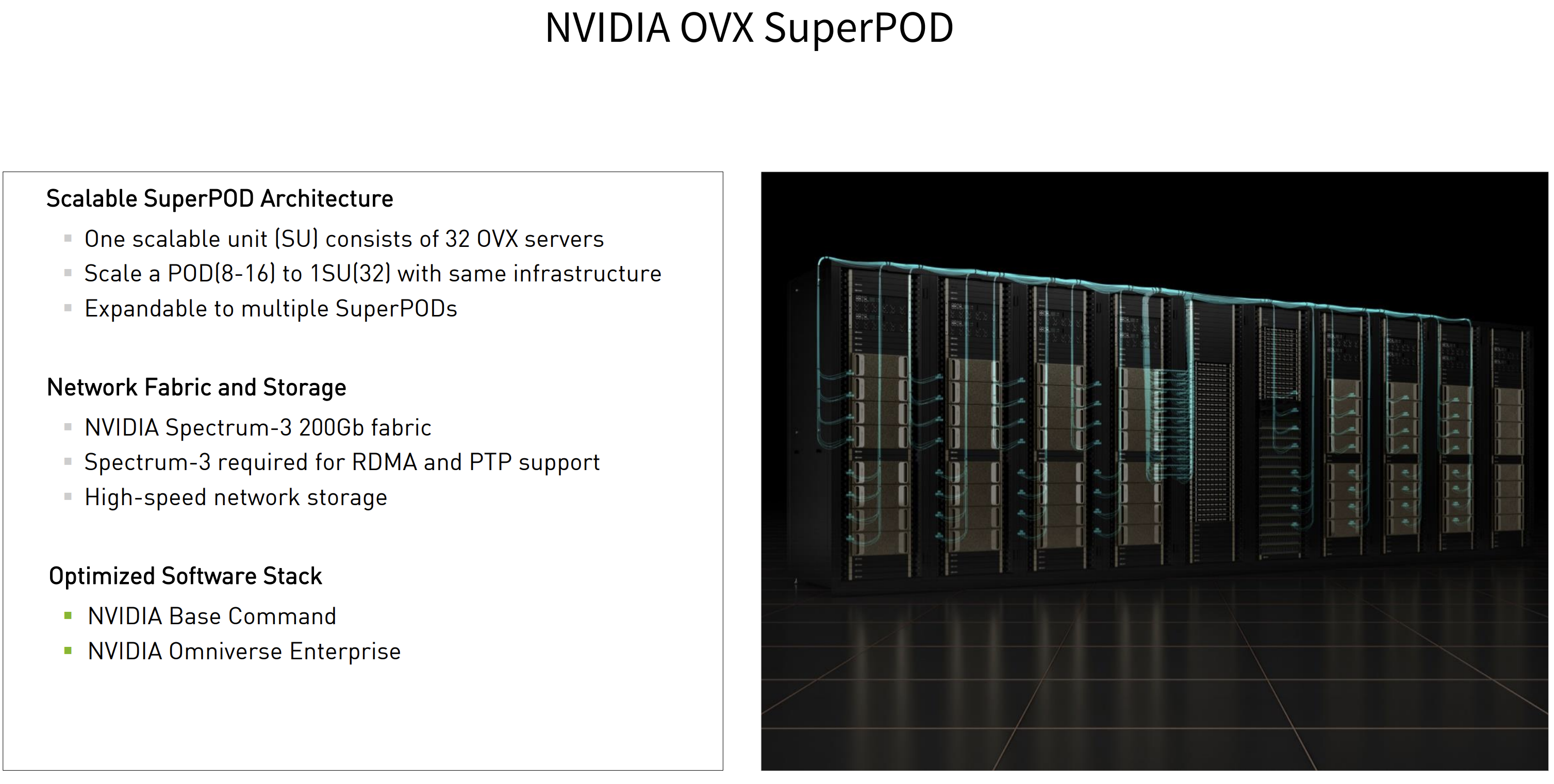 除此之外 ,NVIDIA还提供了OVX POD和OVX SuperPOD,引入了NVIDIA Spectrum-4以太网网络平台,Spectrum-4 400Gbps交换机除了更高效、更安全、更节能省电,还支持128个400GbE端口的51.2Tbps聚合ASIC带宽,以及自适应路由选择和增强拥塞控制机制。