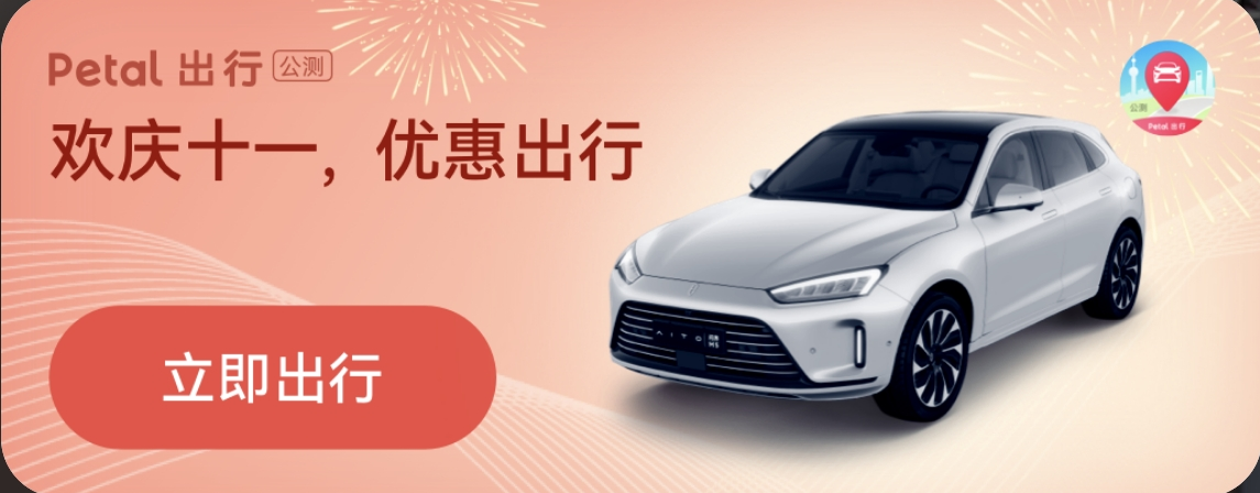 在全新的智慧打车体验之外, Petal 出行还联合神州专车、T3出行等合作伙伴,贴心提供多重打车优惠福利,让更多用户在国庆期间打车更省钱: