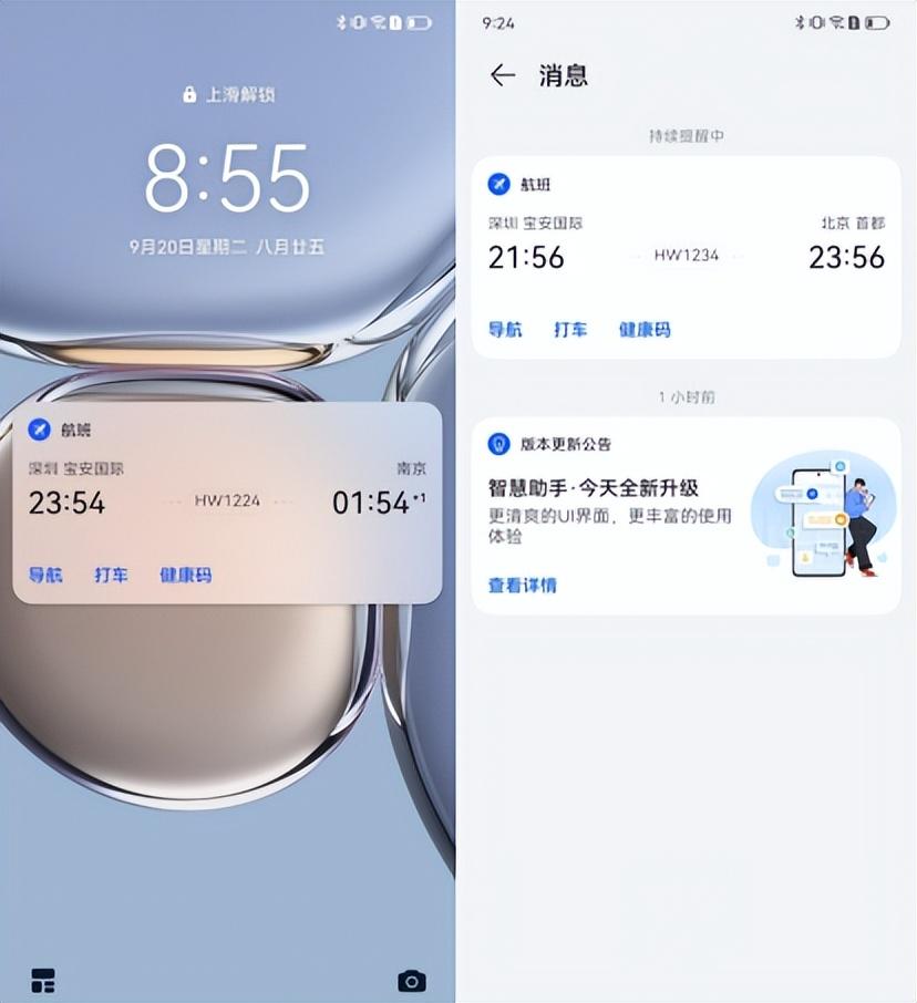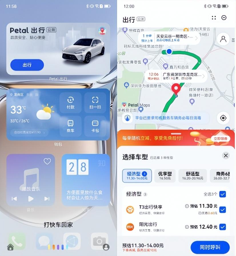Petal 出行还基于负一屏航班、高铁、通勤智能提醒卡片,支持行程出发及到达时便捷打车。只要从手机主桌面右滑一下进入负一屏,即可基于航班/高铁行程,贴心弹出行程提醒卡片,并展现实时航班/高铁信息。而当需要前往机场、高铁站时,也无需再打开App叫车,点击行程提醒卡片上的【打车】就能一键调出Petal 出行,妥妥的智慧出行小助手。
