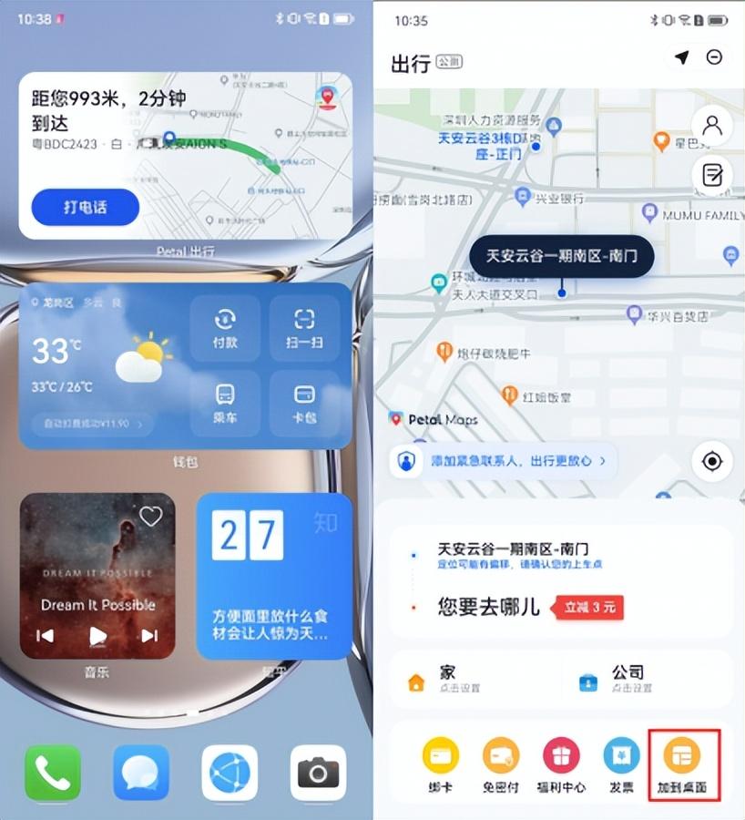 基于HarmonyOS 3, Petal 出行服务卡片可动态呈现打车任务信息。在等车期间,不需要点进App,通过桌面服务卡片就可以直接看到车辆颜色、车型、车牌号、预计等候时长、车辆位置变化等信息,实时掌握行程动态。同时基于多种多样的鸿蒙服务卡片,用户可在桌面查看打车信息的时候,直接点击播放音乐、浏览卡片资讯等,体验鸿蒙服务卡片的高效流畅!在Petal 出行中点击右下方【加到桌面】按钮,就可以快速添加卡片了。
