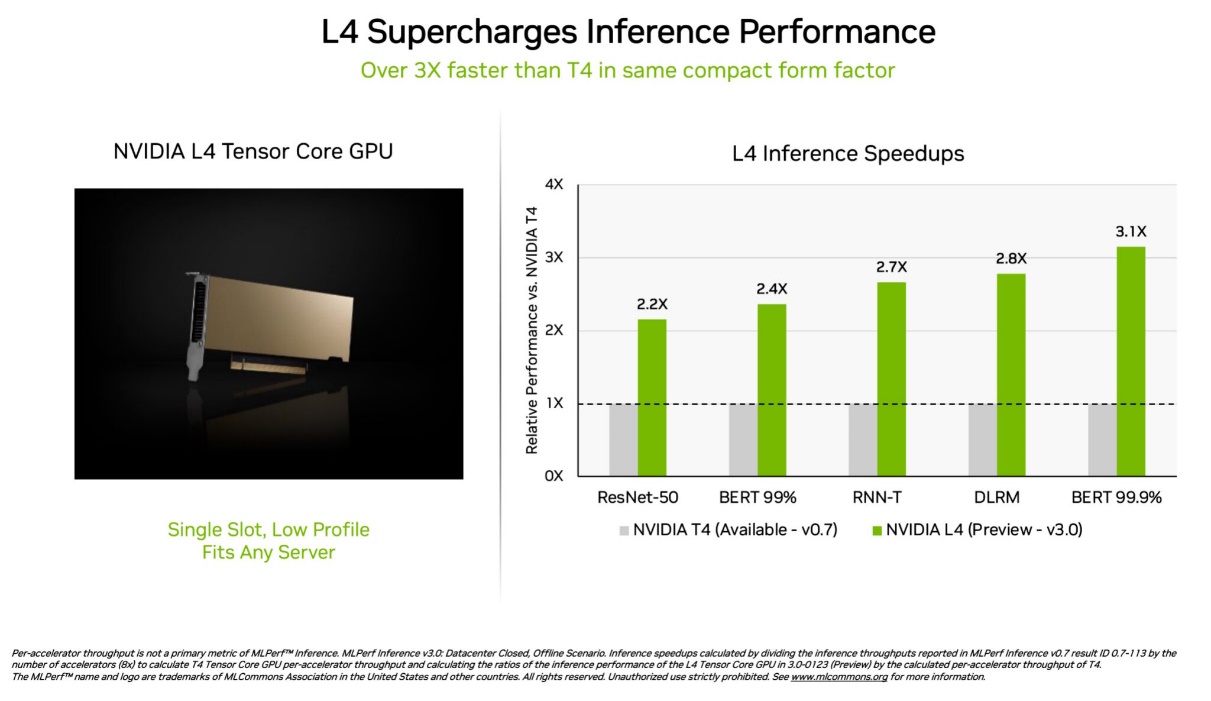 NVIDIA L4 Tensor Core GPU在本次MLPerf测试中首次亮相,其速度是上一代T4 GPU的3倍以上。这些加速器具有扁平的外形,可在几乎所有的服务器中提供高吞吐量和低延迟。