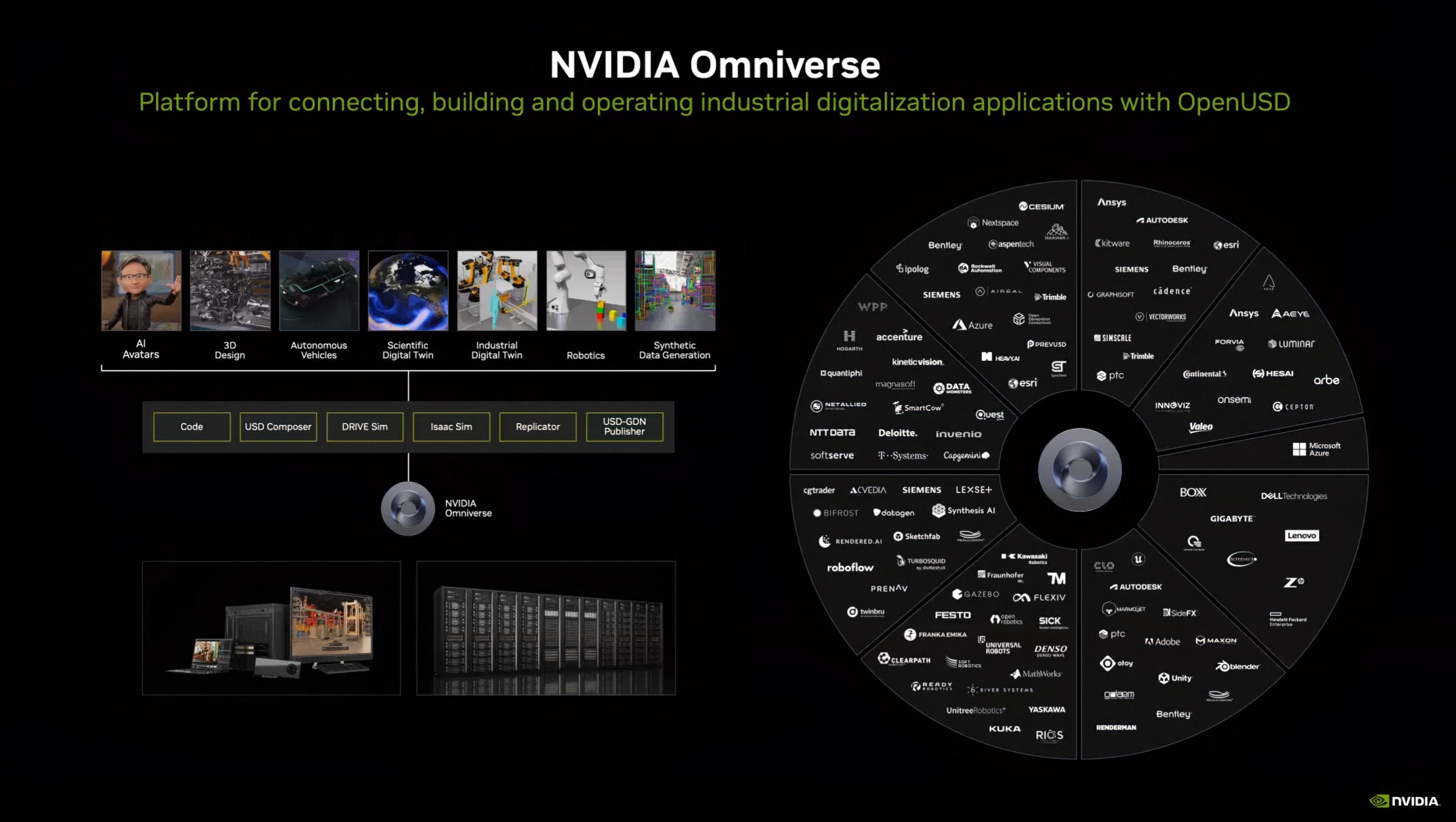 NVIDIA通过 NVIDIA Omniverse与新的技术组合、ChatUSD和RunUSD等云应用编程接口以及OpenUSD开发者计划来推进OpenUSD的发展。Omniverse是一个独特的开发平台,用于设计、构建、操作和优化工业数字化应用程序。