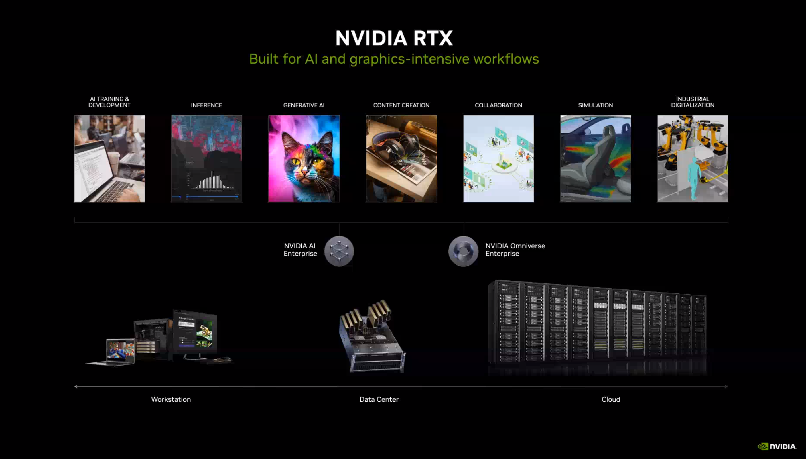 为了满足对生成式AI不断增长的需求,现代人工智能数据中心需要最新的GPU 来训练和部署世界上不断进步的数据中心需要快速GPU进行演算以获得最佳的数据中心吞吐量。英伟达还发布了三款全新台式工作站Ada架构GPU——NVIDIA RTX 5000、RTX 4500和RTX 4000带来最新的AI、图形和实时渲染技术。