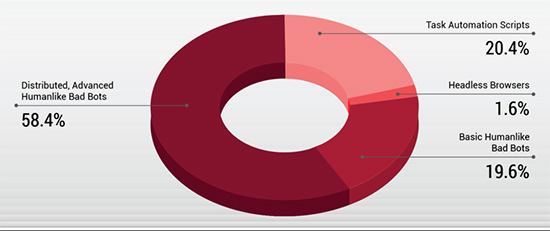 由于每次中断都会影响收入,多数电商企业都会在应用防护上进行大量投资。因此,在针对此垂直行业的总体恶意机器人程序活动中,存在非常多(58%)的分布式变异机器人程序。黑客可以利用复杂机器人程序来规避依赖数据和行为分析的机器人管理技术,而这些数据和行为分析不足以将不同违规行为关联起来。