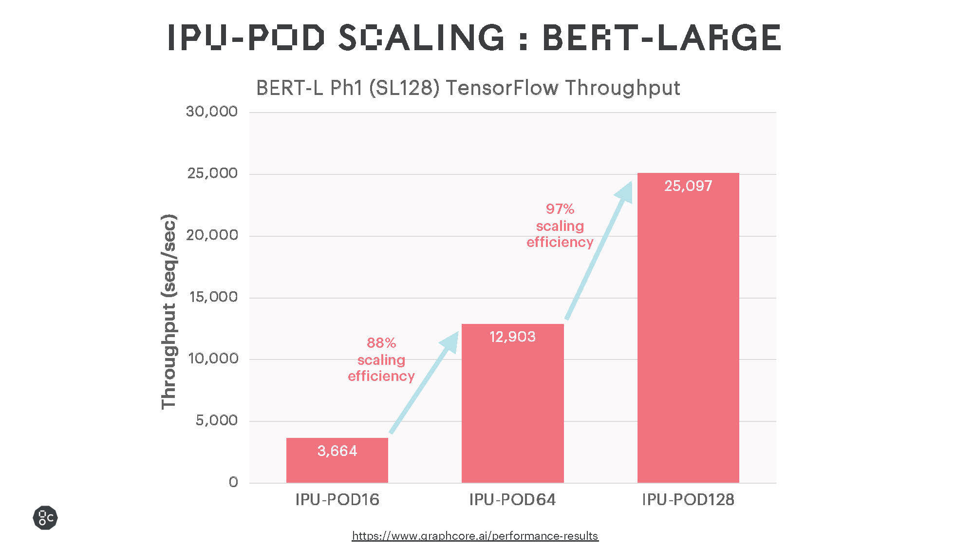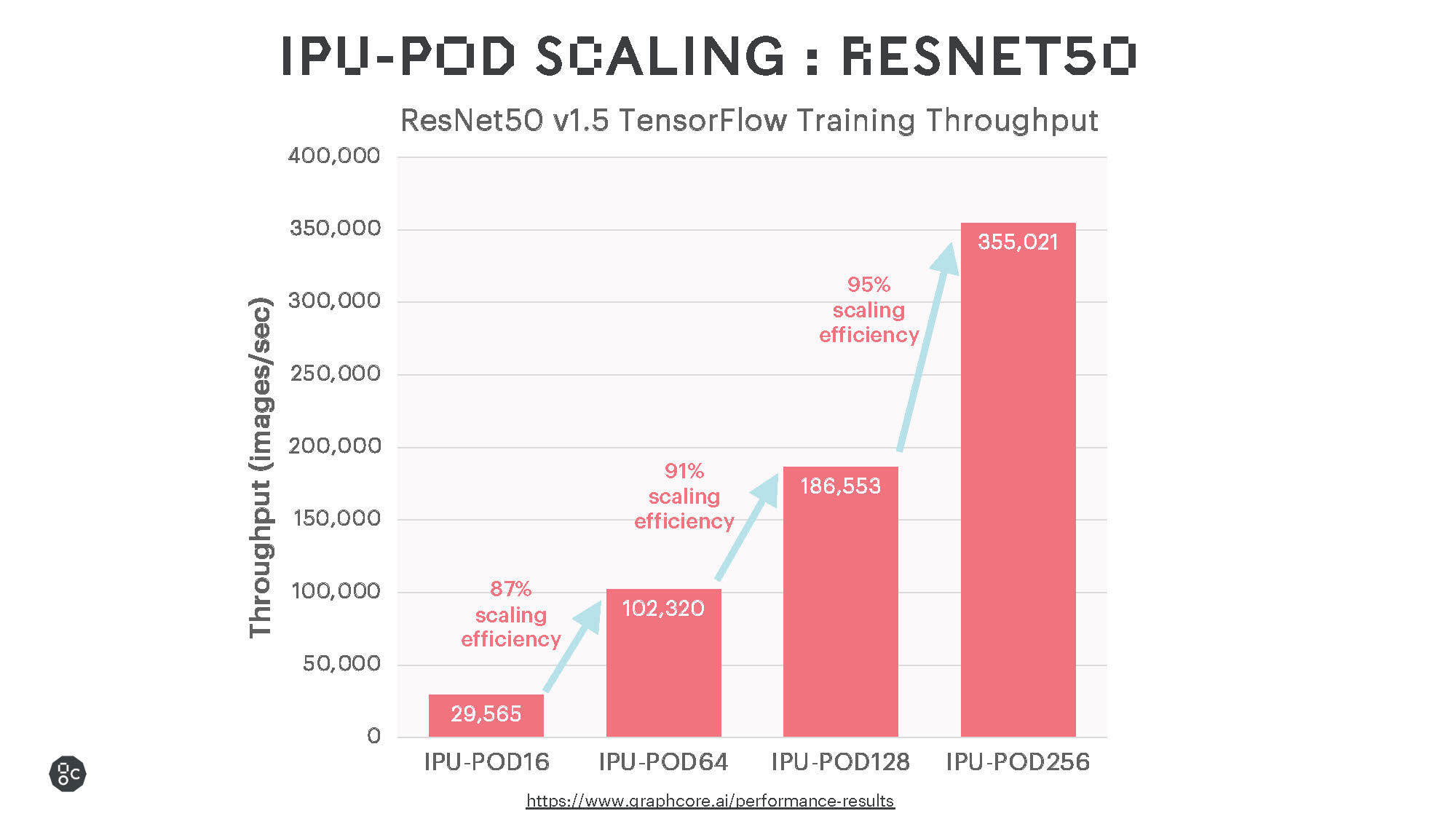 广泛使用的语言和视觉模型的结果显示,IPU-POD128和IPU-POD256具有极为出色的训练性能和高效的扩展能力,随着未来软件的优化,这两大产品有望进一步提高性能。