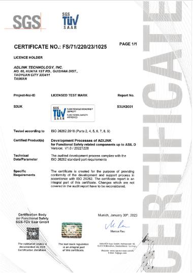 · 凌华科技通过 ISO 26262 认证,建立开发过程中所使用的安全相关功能以及流程、方法和工具所需要满足的要求,并确保在整个车辆生命周期内达到并保持足够的安全水平