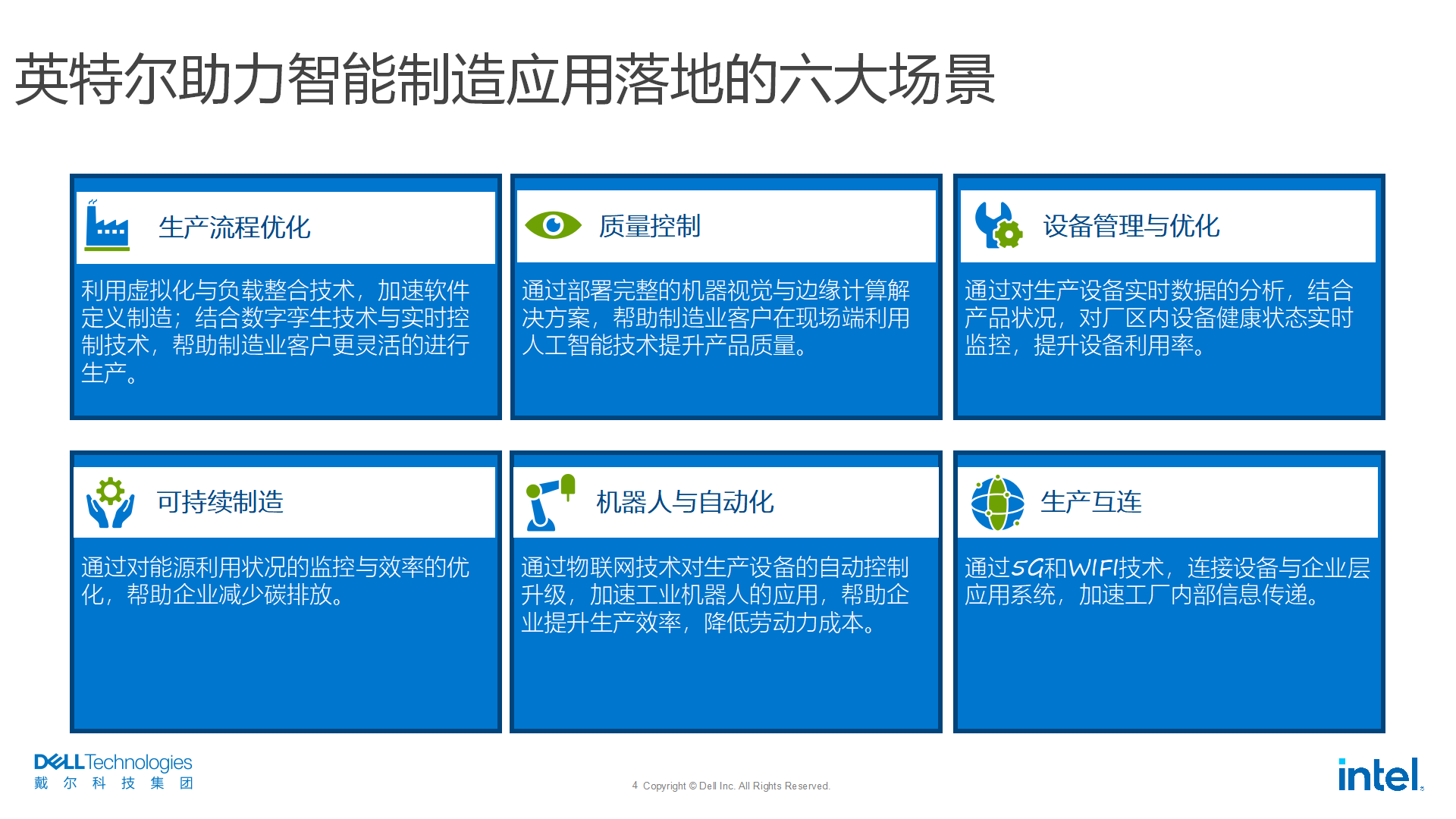 英特尔特别重视应用场景的落地,所以,依托强大的技术实力,将智能制造分成六大场景,其中包括:生产流程优化、质量控制、设备管理与优化、可持续制造、机器人与自动化,以及生产互连。通过对以上六大场景的定义,并且与戴尔科技集团等生态合作伙伴之间的合作,共同推动了制造企业向智造企业的转变。
