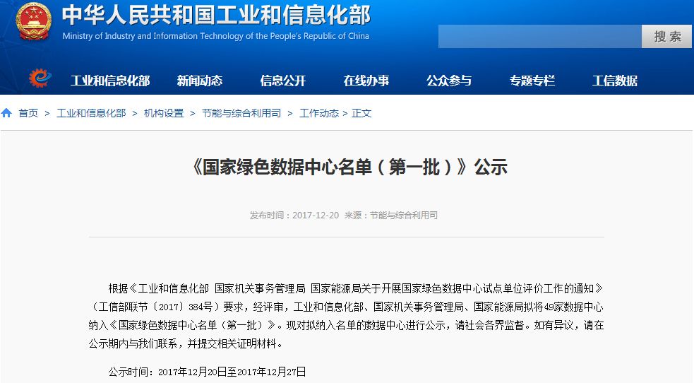 为推动我国数据中心产业持续健康发展,2013年2月工信部发布了《关于进一步加强通信业节能减排工作的指导意见》,提出了数据中心节能环保的要求。今年8月,工信部又发布了《关于组织申报2017年度国家新型工业化产业示范基地的通知》,明确规定了大型规模以上(包括大型规模)数据中心的年均PUE必须小于等于1.5,中小型数据中心的年均PUE必须小于等于1.7。