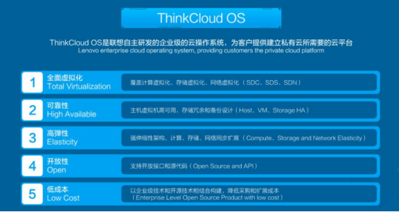 3、 云计算:ThinkCloud OS是联想自主研发的企业级的云操作系统,它充分支持企业搭建混合云平台的需求,为客户提供建立所需的云平台,并提供资源弹性扩展和容灾备份的能力。