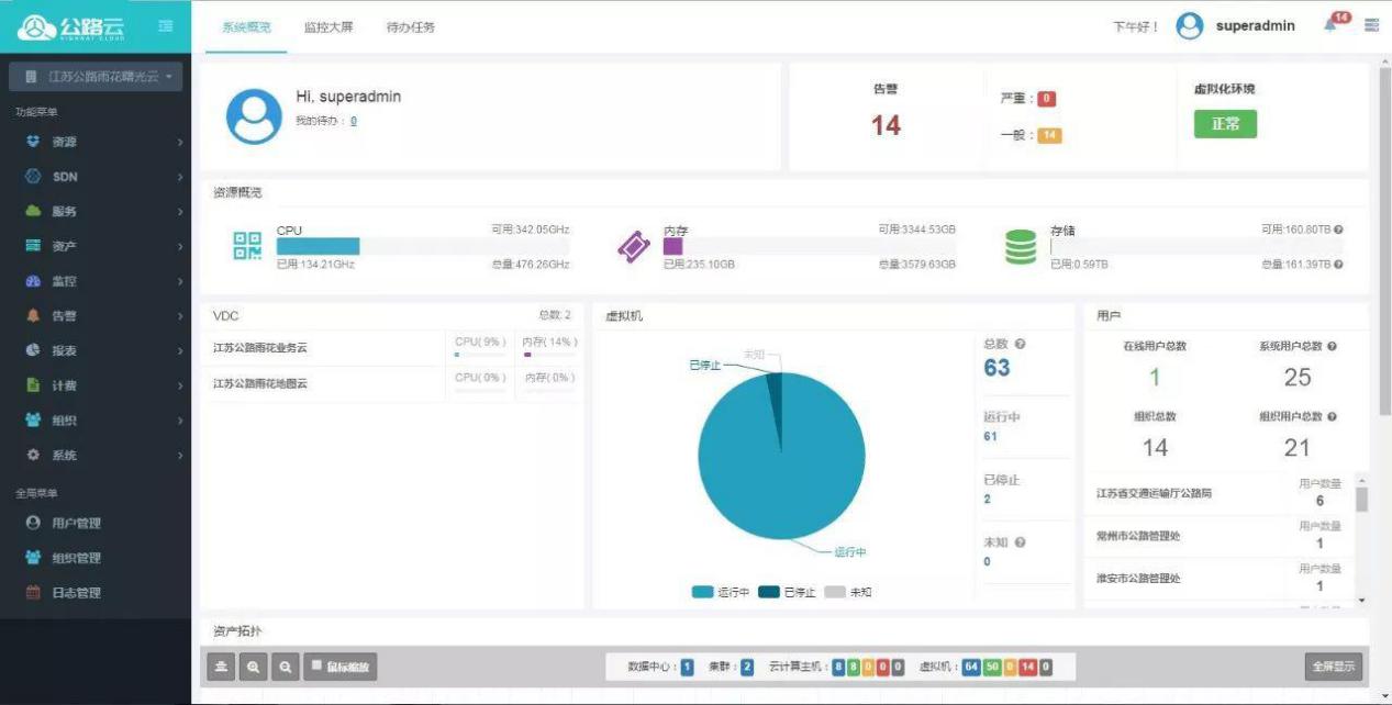 江苏“公路云”是江苏省省交通运输厅公路局在全省“交通云”架构下建设的行业私有云,也是全国首个服务省域范围普通公路行业应用的云平台。