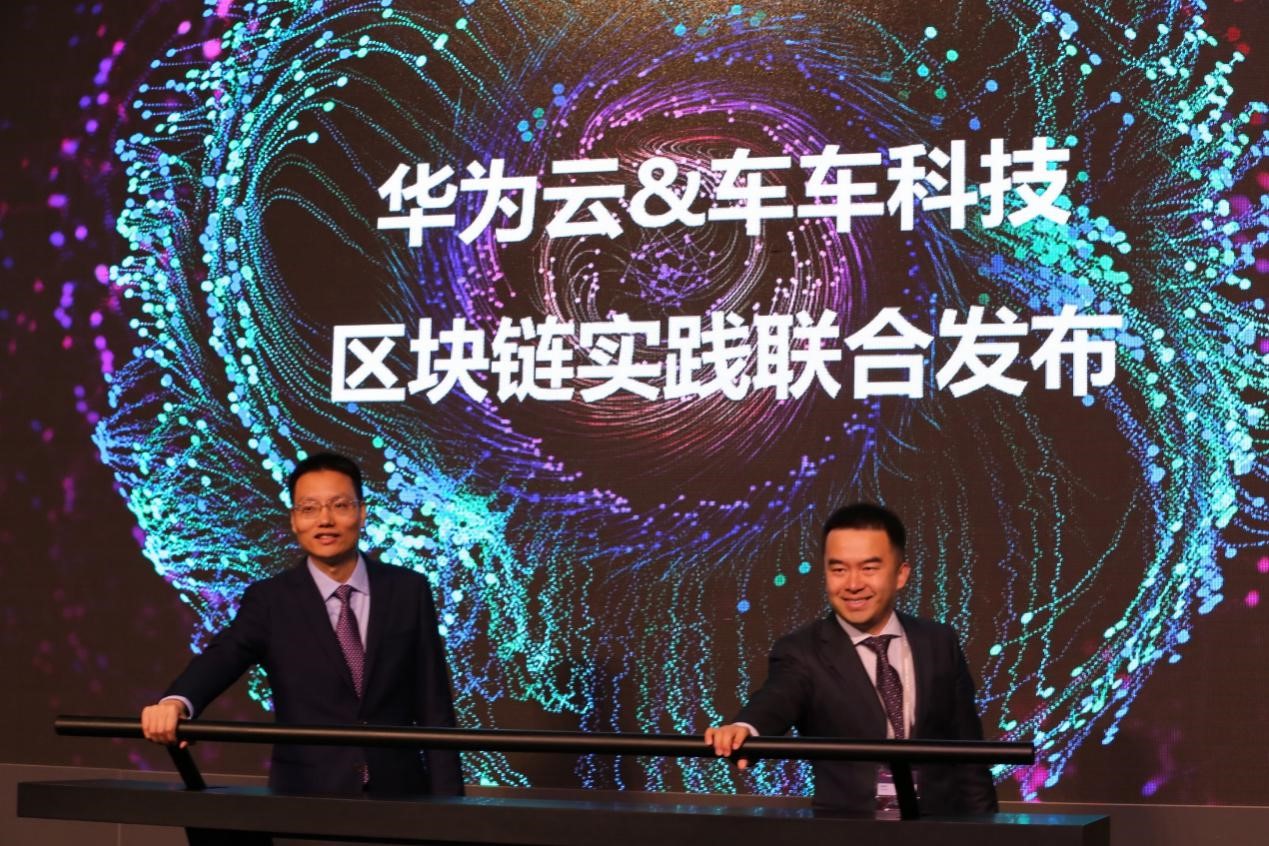 图为华为云PaaS服务产品部部长廖振钦与车车科技创始人兼CEO张磊进行方案联合发布