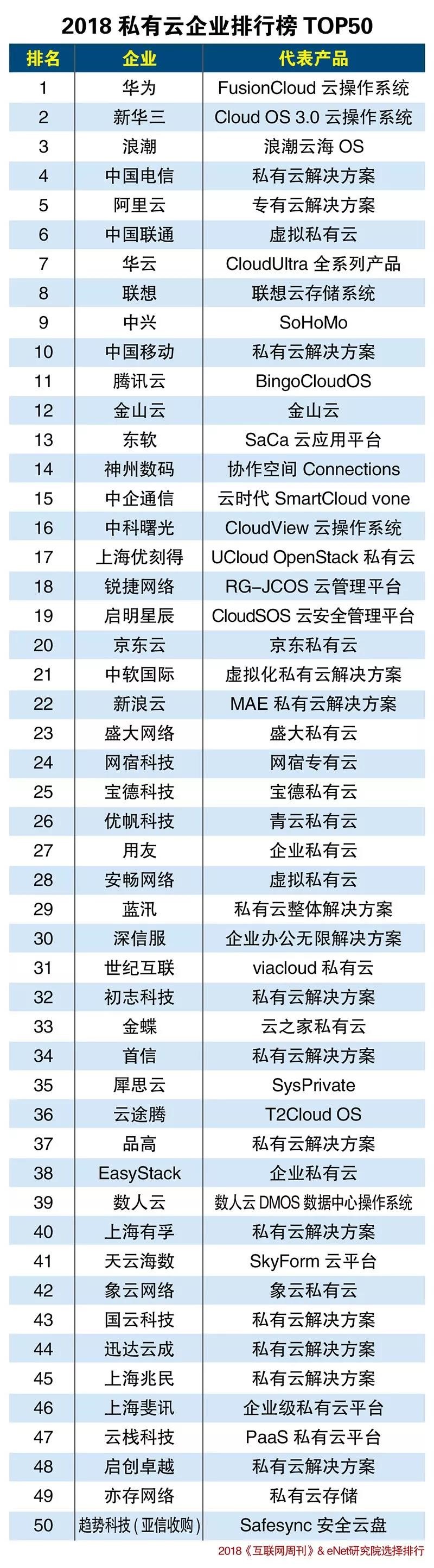4月27日,中国北京——《互联网周刊》&eNet研究院对中国私有云市场及私有云厂商进行了分析和调研,了解了用户需求,并根据用户反馈列出了“2018私有云企业排行榜TOP50”,华云数据凭借其在中国私有云市场的占有率和用户认可度位列第七。
