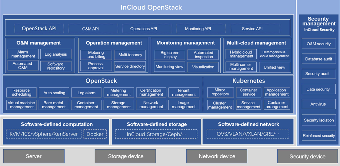 InCloud OpenStack 5.5基于OpenStack架构实现了虚拟机、裸机、容器三种计算资源的同平台统一管理和对外提供服务,进行三种资源的并行调度,实现集计算、存储和网络资源的融合共享,降低运维与管理成本。