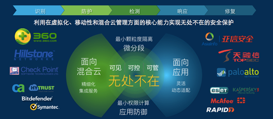 在共同的理念和开放的平台上,不同的安全厂商的服务无缝整合起来,共同合作推动整体方案落地,面向应用,贯穿安全中的识别、防护、监测、响应、修复全过程,利用在虚拟化、移动性和混合云管理方面的核心能力,为客户实现无处不在的安全保护。