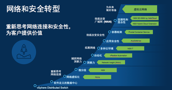 同时,为了实现VCN这愿景,VMware构筑一个可快速落地的NSX为核心的网络平台,这个平台具备了云平台的一致性、集成的安全服务与高度自动化的能力,包含NSX数据中心版、软件定义的广域网NXS SD-WAN by VeloCloud、扩展数据中心网络到公有云NSX Cloud版、混合云连接服务NSX Hybrid Connect以及提供面向应用的安全服务、网络监控与自动化AppDefense和实现网络监控和自动化的Network Insight。