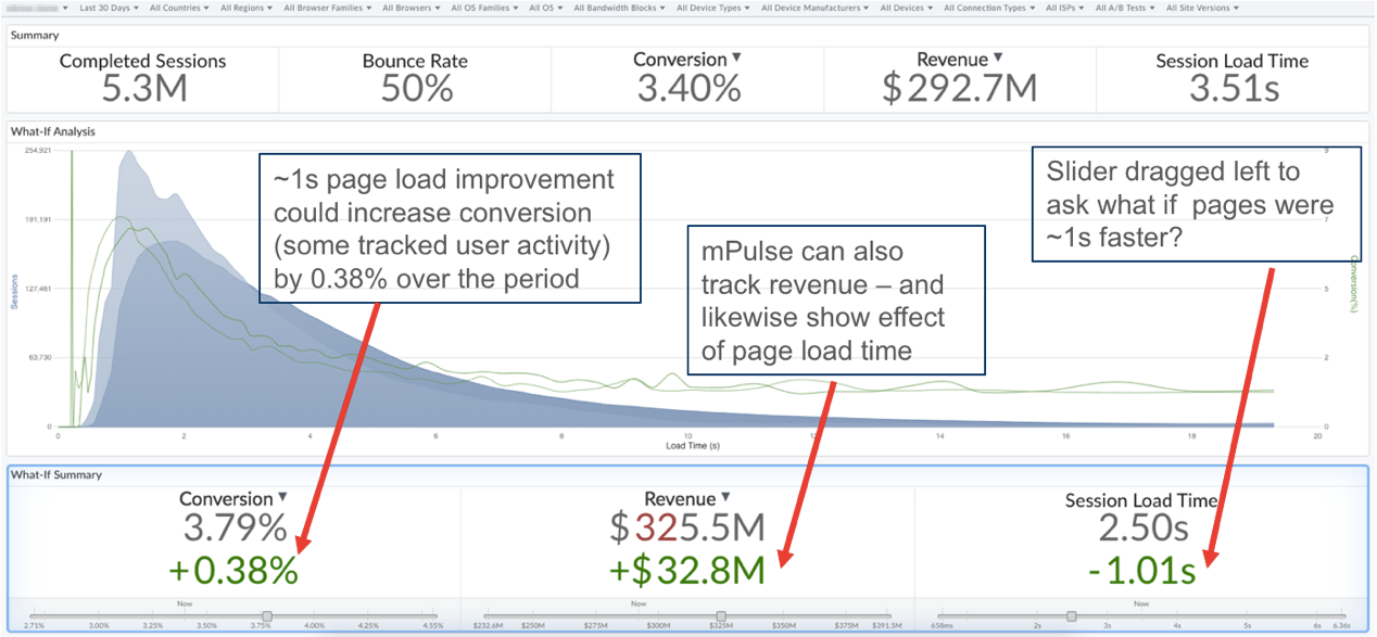假设您的用户访问当前页面的加载时间为3.51秒,在当前的性能表现状态下,交易转化率为3.4%,在线交易额为3亿2千550万美金,那么,您想了解当性能提升时对业务的影响,您只需将滑块向左拖动即可模拟当加载时间减少到2.50秒时,在图五的屏幕截图中,您可以立即看到这种改变对转换率和交易额所产生的正面影响。