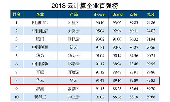 “2018云计算企业百强榜”由《互联网周刊》&eNet研究院选择排行,其中iSite是自身互联网建设能力,iBrand是网络社会影响力,iPower是行业地位。在本次排名中,华云在iPower、iBrand和iSite三个项目的分数为91.47、89.16、79.89,总分为89.85,位列第八。