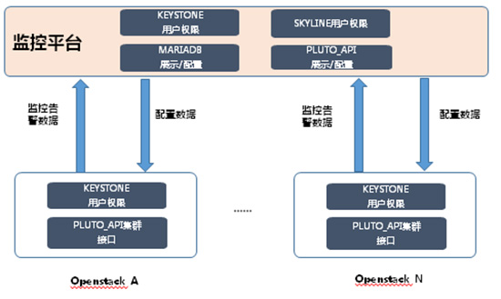 随着多云的应用越来越广泛,多数据中心的集中监控亟待解决。浪潮云平台InCloud OpenStack采用自研监控管理组件pluto级联方案,每个OpenStack集群采用独立的pluto用于配置管理上层pluto的接口进行调用;而上层的监控平台的pluto对所有集群的pluto进行统管,并对各集群数据进行分析。其架构图如下所示: