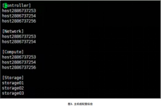 主机组部分: 存放所有主机组(集群角色)信息,包括主机组名称(包含控制节点,网络节点, 计算节点, 存储节点), 以及相关的主机名。
