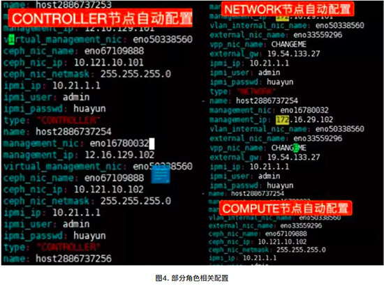 角色相关配置: 针对不同的角色主机的自动化配置,如网卡, 主机, 存储, IPMI等信息的配置。