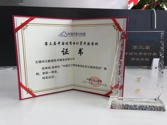 华云数据提供技术支持的兵工物资集团案例获第三届中国优秀云计算开源案例评选一等奖