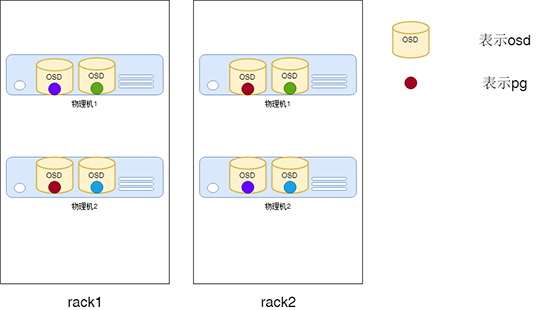 我们为此添加Rack级的Bucket,分别包含两个存储节点(以Host的Bucket),然后以Rack为隔离域,保证两个副本分别落在不同的Rack上。