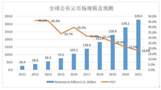 2017年,全球公有云市场规模为1384亿美元,到2021年,全球公有云市场规模将增加到3283亿美元,四年复合增长率CAGR 24.1%;中国公有云市场规模将增加到902亿元,四年复合增长率35.8%,均远高于同期全球IT支出的增长(不足5%)。云计算中短期需求来自企业和政府上云和政策的推动,长期来自新技术和新的应用场景下数据爆炸式增长带来的计算、存储和传输需求。