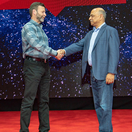 (从左至右)红帽执行副总裁兼产品和技术部门总裁Paul Cormier、IBM云计算与认知软件业务全球高级副总裁、IBM全球研究院院长Arvind Krishna