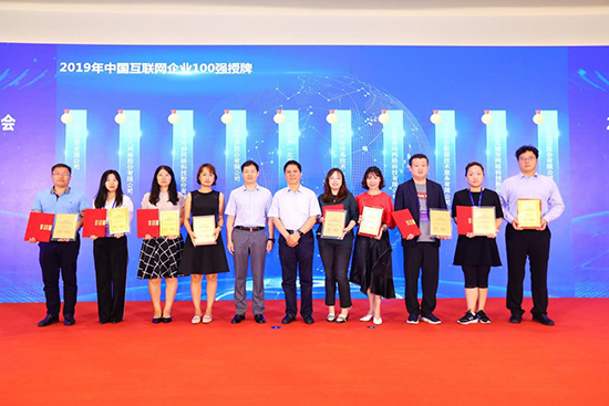 登台领取“2019年中国互联网企业100强”证书和奖状