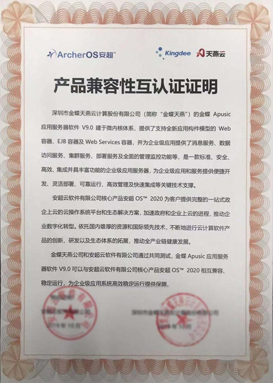 此次互认证证明,经华云数据和金蝶天燕共同测试得出:金蝶Apusic应用服务器软件V9.0可以与安超OS 2020相互兼容、稳定运行,为企业级应用系统高效稳定运行提供保障。