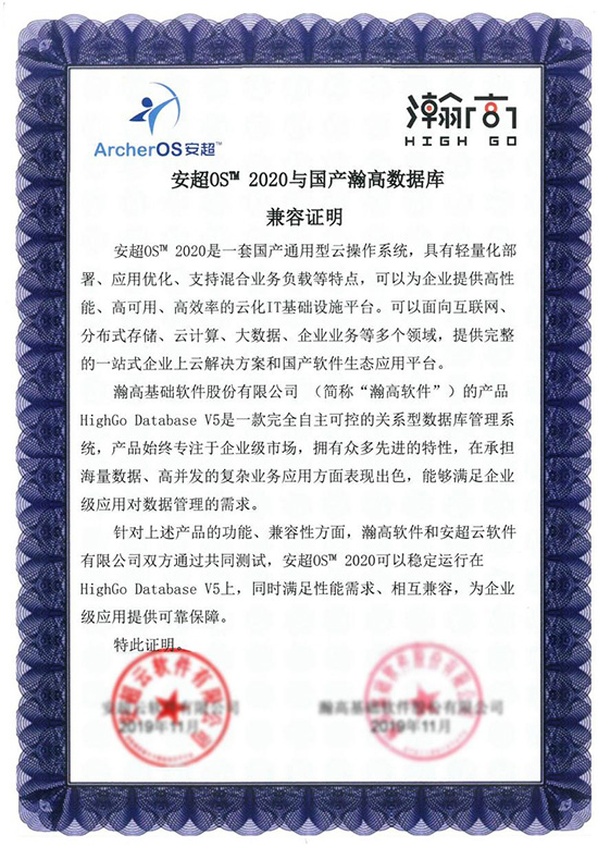 日前,华云数据推出的国产通用型云操作系统安超OS 2020与瀚高软件的HighGo Database V5完成兼容性互认证明。此次互认证,为政企用户提供安全、可靠、适用的自主创新产品,让其全面上云无后顾之忧,推动国产基础软硬件产业生态链的良性发展。