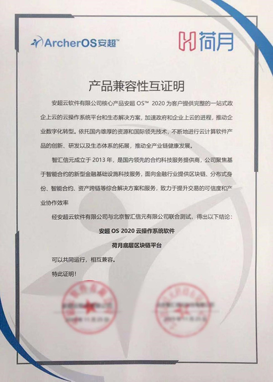 日前,华云数据推出的国产通用型云操作系统安超OS™ 2020与荷月底层区块链平台完成产品兼容性互认证。此次互认证,为金融用户提供高安全、高可靠、简单易用的自主创新产品,支持金融用户能够在云上快速部署区块链环境,助力金融用户全面上云,为其快速发展提供有效助力。