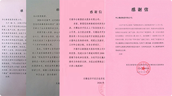 除了江苏省工信厅,华云数据还收到了来自无锡经济开发区经济发展局、无锡市公安局滨湖分局雪浪派出所的感谢信。感谢华云数据在这次的战疫中伸出援助之手,提供大量医用口罩,解决一线工作人员个人防护的燃眉之急。