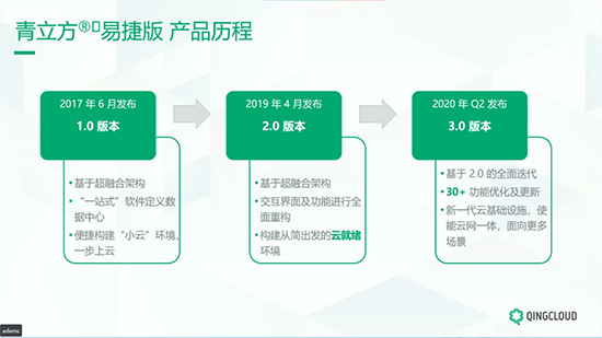 事实上,青立方超融合易捷版此前已经经过了3个版本的进化。即从2017年6月发布的旨在帮助客户构建“小云”环境的1.0版本,到去年在原版本基础上对交互界面及功能重构的2.0版,再到如今发布的版本。