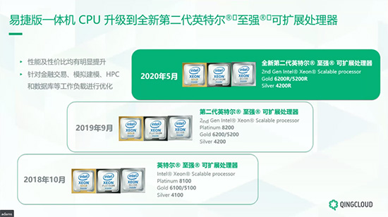 今年,英特尔发布全新第二代至强可扩展处理器,这也使得青立方超融合易捷版整体的能力得到稳步提升。同时,易捷版针对金融交易类、模拟建模类、高性能计算类和数据库等场景,对于性能非常敏感的工作负载上做了深度优化。