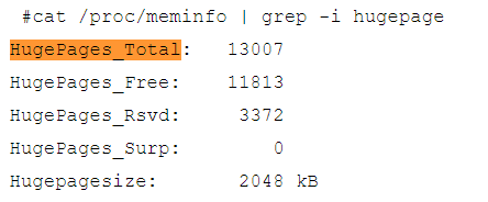从上面的信息可以得出以下结论:当前hugepages一共实际使用了13007-11813=1194个pages(不包括预留的),预留了3372个pages。永远不会使用达到了11813-3372=8841个pages。每个page大小为2M,也就是说有接近16.5G的hugepages内存被浪费了(因为hugepages无法swap,所以不能被其它程序所使用)。换句话说:当前系统使用中或者即将被使用的hugepages的总和为HugePages_Total-HugePages_Free+HugePages_Rsvd=13007-11813+3372=4566个pages。
