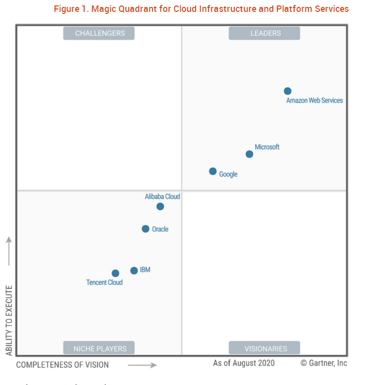 存储服务是云基础设施服务的核心基础之一。Gartner魔力象限连续十年将AWS评为云基础设施服务(IaaS)的领导者,在2020年8月发布的Gartner最新魔力象限Magic Qudrant for Cloud Infrastructure and Platform Services(如下图所示)中继续保持领导者地位。