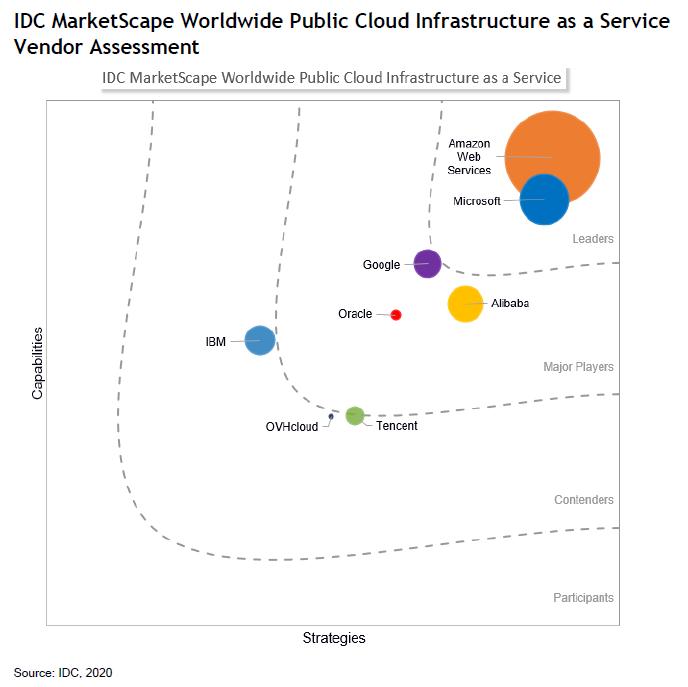 IDC也在历次IDC MarketScape评估中,将AWS评为公有云基础设施服务(IaaS)的领导者。2020年9月发布的《IDC MarketScape:全球公有云IaaS服务供应商评估报告》,AWS继续保持领导者地位(如下图所示)。