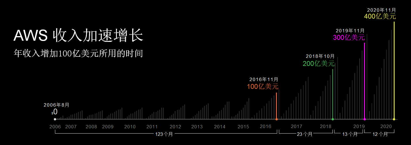 Andy Jassy开场回顾了AWS当前的业务现状。根据亚马逊公布的财报数字,AWS在2020年第三季度达到年化收入460亿美元,同比增长29%,相当于一年增长100亿美元。AWS自身的发展呈现出了加速增长的态势。AWS实现第一个100亿美元收入用了123个月;第二个100亿美元增长用了23个月;第三个100亿美元增长则用了13个月;现在,第四个100亿美元增长只用了12个月。