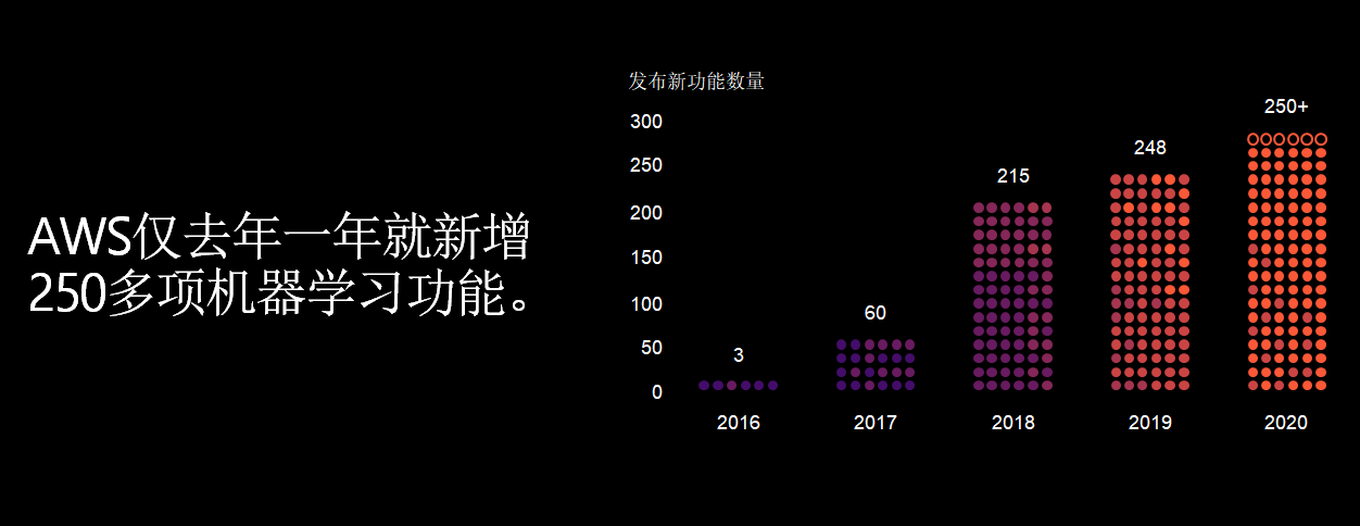 第二个主题是机器学习的成功捷径。以SageMaker为例。由于SageMaker在机器学习中是多数客户及企业所用到的,因此这里也集中了大部分的客户。那么,如何给客户提供捷径?因为这个捷径就是更加易于使用及更加方便地管理整个学习工作流中的每一步。值得指出的是,SageMaker一直在持续迭代,在今年一年时间中就发布了近50个新功能。