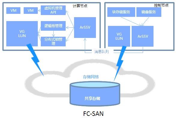 在FC-SAN设备上划分配置好LUN,通过多路径软件映射给物理服务器,在服务器端将映射过来的LUN经由软件层ArSSV虚拟化出一个大的存储资源池,资源池内分出一个个小的逻辑卷(LV),为虚拟机提供块设备(虚拟磁盘)。