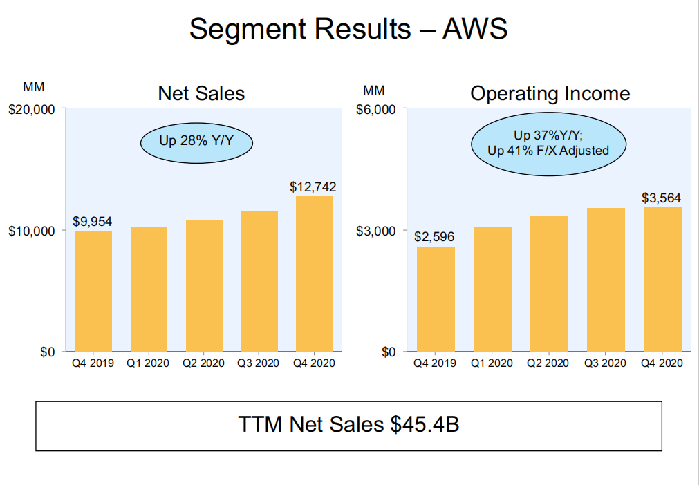 2021年2月2日,亚马逊公司公布了截至2020年12月31日的第四季度财务业绩。2020年第四季度,亚马逊净销售额达到1256亿美元,相比去年同期的874亿美元增长44%。其中,亚马逊云服务(AWS)净销售额达到127.42亿美元,相比去年同期的99.54亿美元增长28%。2020年第4季度运营收入35.64亿美元,相比去年同期的25.96亿美元增长37%。AWS在2020全年净销售额453.7亿美元,相比2019年的350.26亿美元增长了30%;全年运营收入135.31亿美元,2019年为92.01亿美元。亚马逊当天还宣布,杰夫·贝索斯将于2021年第3季度过渡到董事会执行主席一职,AWS CEO Andy Jassy届时将出任亚马逊首席执行官。