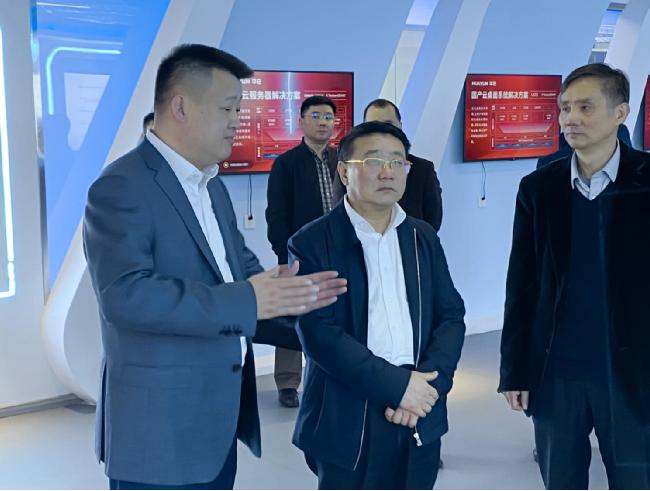 调研组一行领导参观了华云数据的企业展厅,许广彬向调研组详细介绍了华云数据的近年来发展情况以及信创产业实践进展。