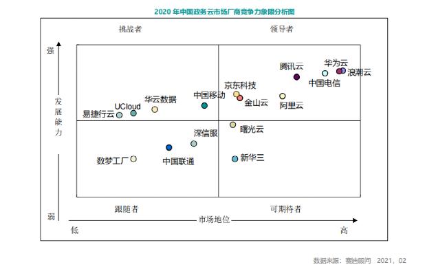 在本次《报告》中,赛迪顾问通过发展能力及市场地位分析了中国政务云市场厂商竞争力。浪潮、华为、阿里云、腾讯云政务云市场占有率高,处于市场领导者地位。中国移动、华云数据等企业紧随其后,从各细分领域迅速切入政务云市场,成为政务云市场主力厂商。