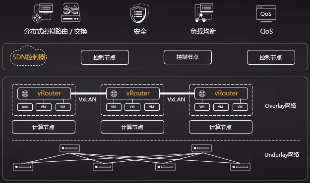 ● 纯软件定义,无需绑定硬件,只需经典的TCP/IP物理网络作为底层(Underlay),利用虚拟网络叠加层(VxLAN Overlay)。