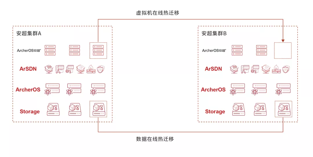 安超云基座解决方案支持多种迁移方式,包括集群内虚拟机和存储的离线迁移、在线迁移,甚至是跨集群迁移。其中跨集群在线迁移具备的特性如下: